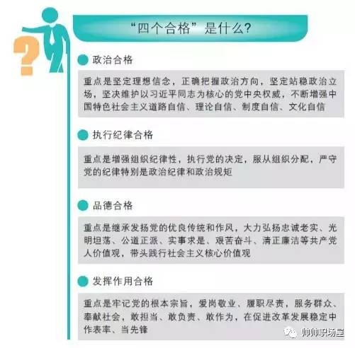 各级党组织要教育引导广大党员按照“四讲四有”标准,做到政治合格、执行纪律合格、品德合格、发挥作用合格。 在政治合格方面,重点是坚定理想信念,正确把握政治方向,坚定站稳政治立场,坚决维护以习近平同志为核心的党中央权威,不断增强中国特色社会主义道路自信、理论自信、制度自信、文化自信。 在执行纪律合格方面,重点是增强组织纪律性,执行党的决定,服从组织分配,严守党的纪律特别是政治纪律和政治规矩。 在品德合格方面,重点是继承发扬党的优良传统和作风,大力弘扬忠诚老实、光明坦荡、公道正派、实事求是、艰苦奋斗、清正廉洁等共产党人价值观,带头践行社会主义核心价值观。 在发挥作用合格方面,重点是牢记党的根本宗旨,爱岗敬业、履职尽责,服务群众、奉献社会,敢担当、敢负责、敢作为,在促进改革发展稳定中作表率、当先锋。