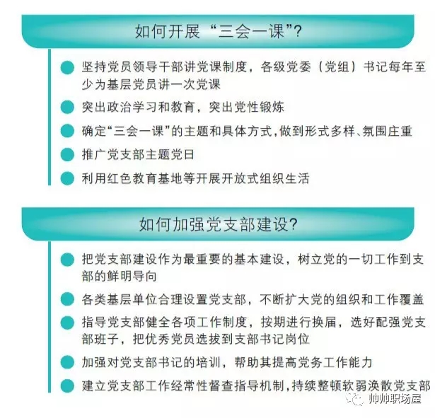 党支部是党最基本的组织,是党全部工作和战斗力的基础。要树立党的一切工作到支部的鲜明导向,注重把思想政治工作落到支部,把从严教育管理党员落到支部,把群众工作落到支部。 各领域各行业党支部要充分发挥教育管理党员的主体作用,运用“三会一课”等制度抓好“两学一做”学习教育,真正成为教育党员的学校、团结群众的核心、攻坚克难的堡垒。 党支部要组织党员按期参加党员大会、党小组会和上党课,定期召开支部委员会会议。 坚持党员领导干部讲党课制度,各级党委(党组)书记每年至少为基层党员讲一次党课,党课内容要贴近党员、贴近实际,不搞照本宣科。 “三会一课”要突出政治学习和教育,突出党性锻炼,坚决防止表面化、形式化、娱乐化、庸俗化。要以学习党章党规、学习习近平总书记系列重要讲话为主要内容,针对党员思想工作实际,确定“三会一课”的主题和具体方式,做到形式多样、氛围庄重。 推广党支部主题党日,组织党员在主题党日开展“三会一课”、交纳党费、参加服务群众等活动。利用红色教育基地等开展开放式组织生活。 党支部要制定年度“三会一课”计划并报上级党组织备案,如实记录“三会一课”开展情况,对没有正当理由长期不参加“三会一课”的党员,要进行批评教育,促其改正。上级党组织要对党支部执行“三会一课”情况进行指导检查,对不经常、不认真、不严肃的,要批评指正;情况严重的,要采取整顿等措施,进行组织处理。 要把党支部建设作为最重要的基本建设。在各类基层单位中合理设置党支部,不断扩大党的组织和工作覆盖。指导党支部健全各项工作制度,按期进行换届,选好配强党支部班子,把优秀党员选拔到支部书记岗位。加强对党支部书记的培训,帮助其提高党务工作能力。建立党支部工作经常性督查指导机制,持续整顿软弱涣散党支部,为党支部开展工作和活动提供必要保障。