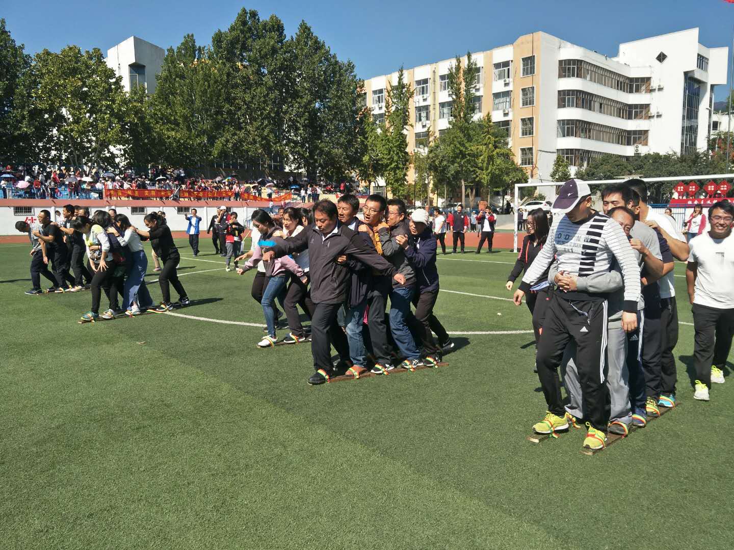 泰安一中2018年教职工运动会于9月29-30日隆重举行,本次运动会设置了男女老年组、中年组和青年组三个组别。来自全校的400多名教师分别参加了男女“足球定点射门”、“实心球投准”、“篮球定点投篮”3个单项项目和“4×100米”接力、“5人踩木屐接力”、“10人单脚火车跑得快”3个集体项目的比赛。 比赛期间老师们奋力拼搏,你追我赶,气氛热烈,笑声不断,既赛出了风格,又赛出了集体凝聚力,充分展现了我校广大教职工健康快乐的运动风采和积极向上的精神风貌。 (工会)
