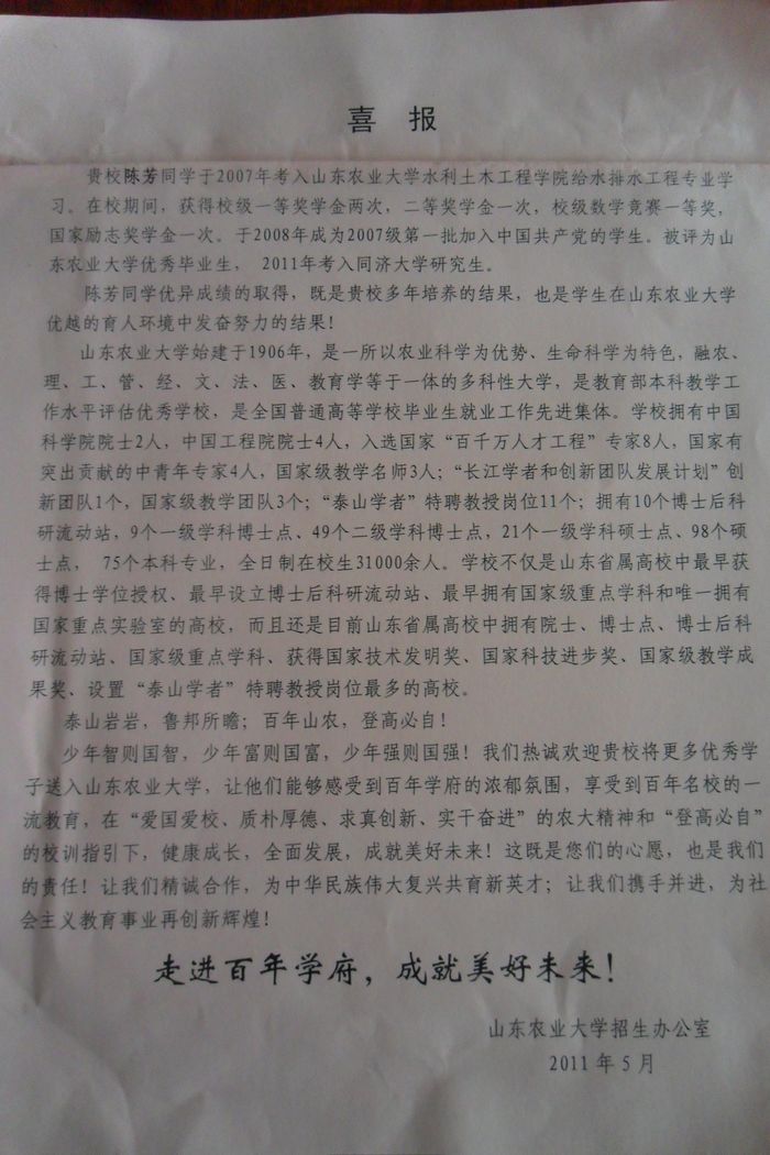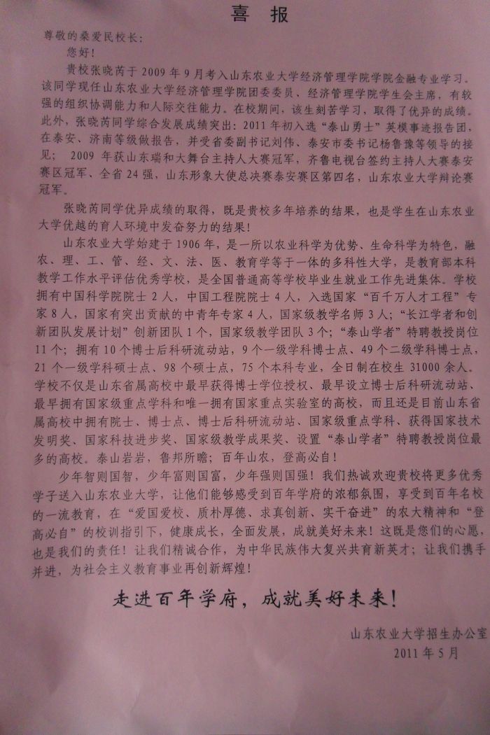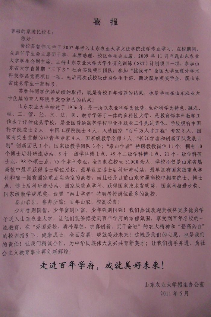 山东农业大学致我校喜报
