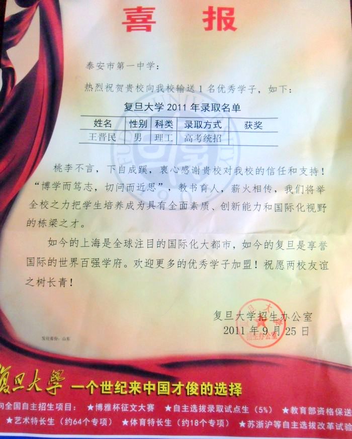 复旦大学致我校喜报