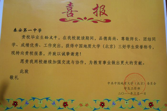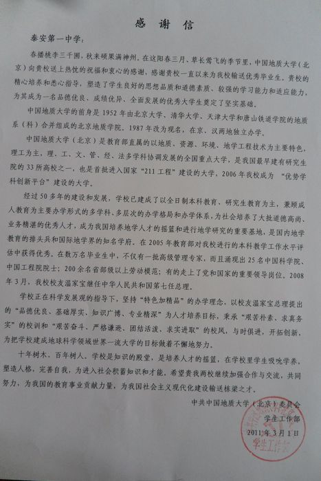 中国地质大学致我校喜报