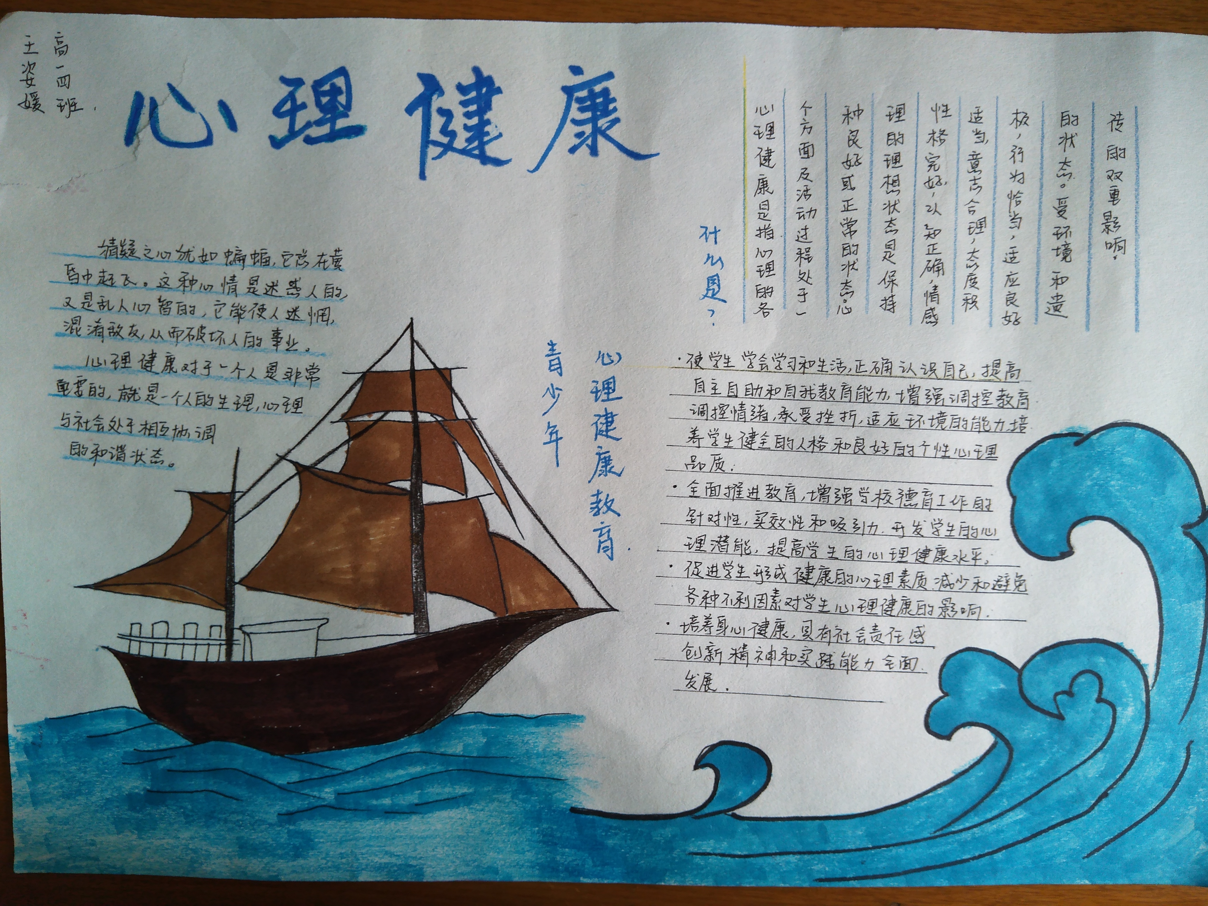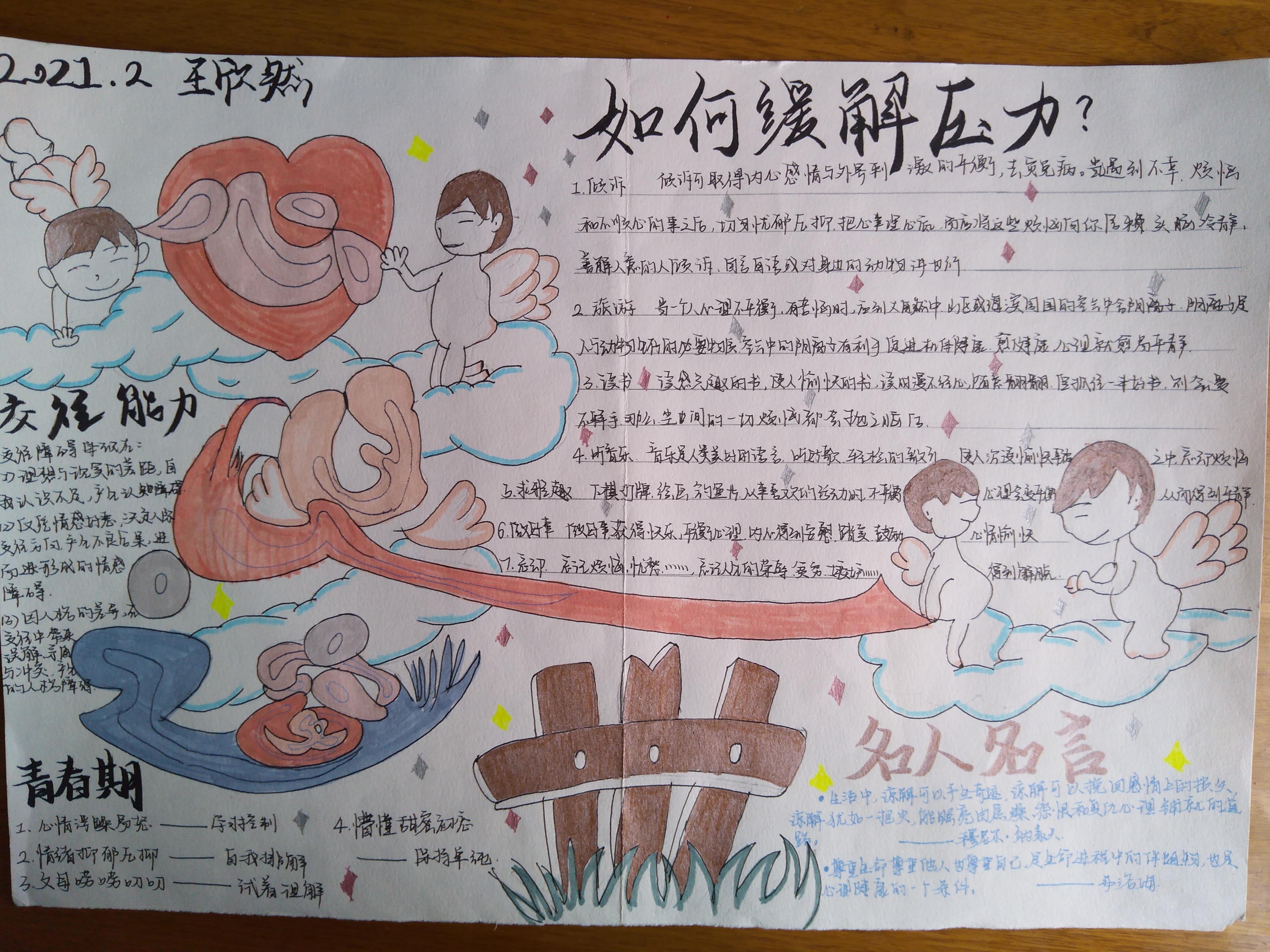 为了更好地普及心理健康教育常识,提高学生的心理自我调节能力,丰富学生的文化生活.近期,泰安一中开展了心理健康手抄报比赛活动。 本次手抄报活动的主题以心理健康教育常识为主,各班心理委员精心组织,同学们积极参与, 借助手中的画笔绘制成了一幅幅版面精美、内容丰富、布局新颖、短小精悍、书写清晰的手抄报作品。心理咨询室的老师和美术办公室老师组成了评审小组,经过认真的评比,本次心理健康手抄报比赛,评出一等奖15人,二等奖14人,优秀奖13人。 2021年心理健康手抄报比赛获奖名单: 一等奖15人 李怡然 王欣然 欧阳佳凝 张泽瑞 梁佳琪 马静怡 宋辰宇 王晓宇 孙淑贤 刘雅茹 王姿媛 张旖旎 王业凡 王雨菲 高 丰 二等奖14人 潘光耀 郭轩辰 李新实 和怡君 张建伟 侯韵函 杨一帆 张仁泽 赵 晨 王俊瑞 王文硕 褚心月 孙玉涵 吴再格格 优秀奖13人 张骞宇 刘旺运 张宪政 韩梦飞 张子恒 张凡锐 吕奕麟 马明阳 赵嘉丽 吕博文 次珠旺久 尼玛曲珍 桑吉卓玛 【部分获奖作品展】