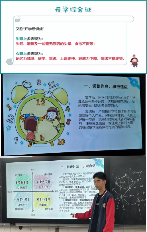 班会第二部分为“开学复课心理调适指南”,先引导学生觉察自己,是否有开学综合征的表现,然后向学生介绍开学复课后心理调试的几种方法。